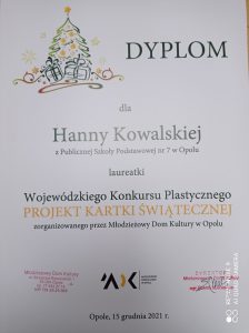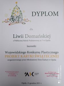 Wzorem lat ubiegłych, na początku grudnia Miejski Dom Kultury w Opolu ogłosił Wojewódzki Konkurs Plastyczny, pt.: „Projekt Kartki Świątecznej”. Udział w nim wzięli uczniowie naszej szkoły: