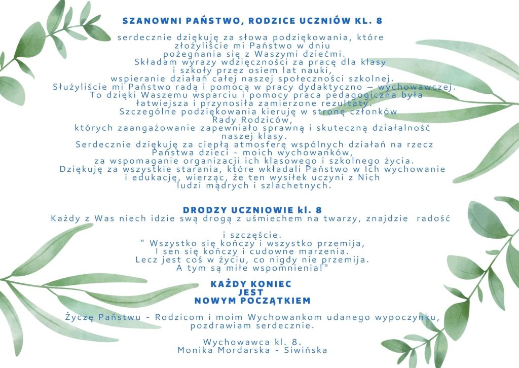 SP 7 Podziękowania i życzenia – kl.8 Poprzedni Konkurs "Healthy life" Nowszy UROCZYSTE ZAKOŃCZENIE ROKU SZKOLNEGO Może Ci się spodobać HALLOWEEN W NASZEJ SZKOLE JAKO FORMA DOBREJ ZABAWY 4 listopada 2023 „Pocztówkowy zawrót głowy” trwa 14 października 2022 Rusza rekrutacja elektroniczna do klas pierwszych! 13 lutego 2023
