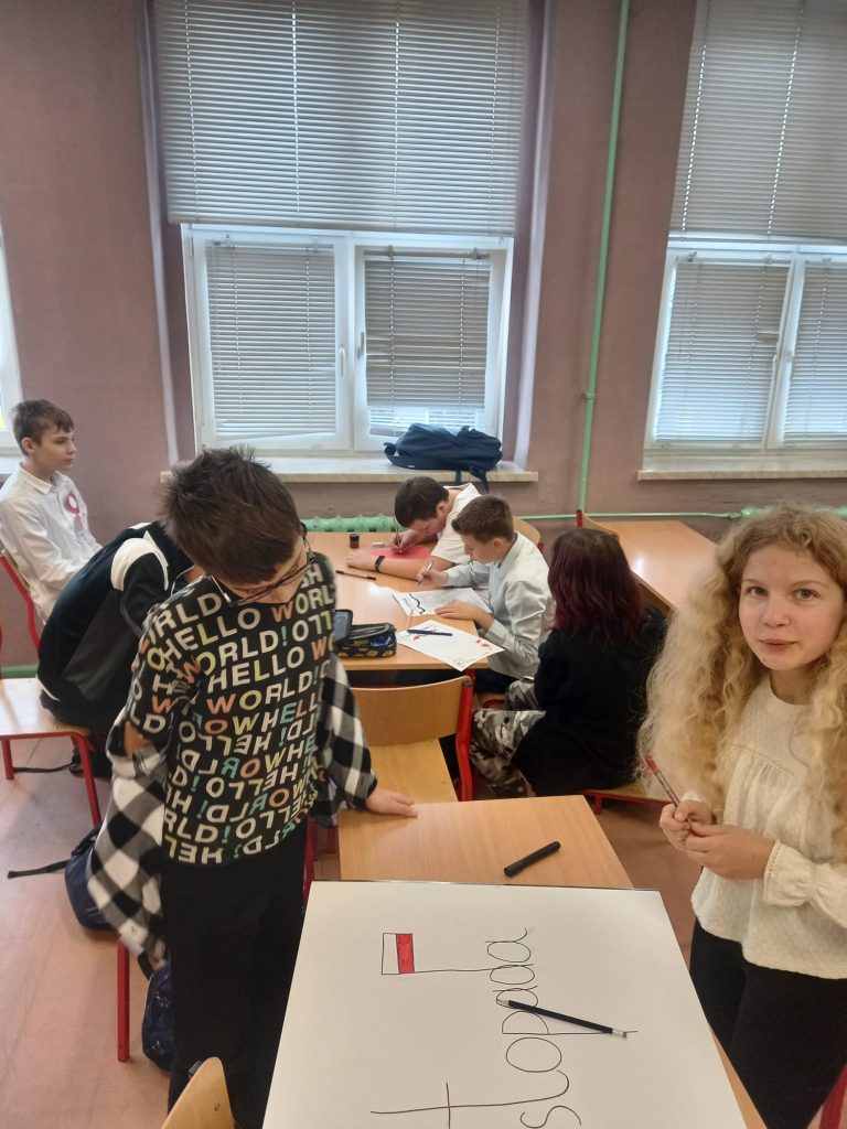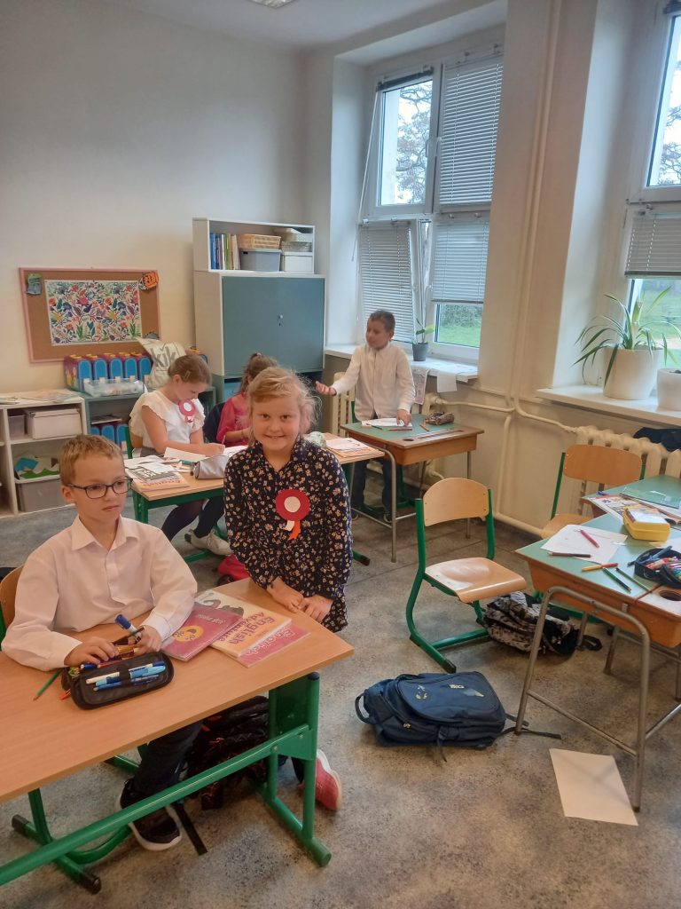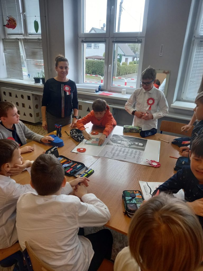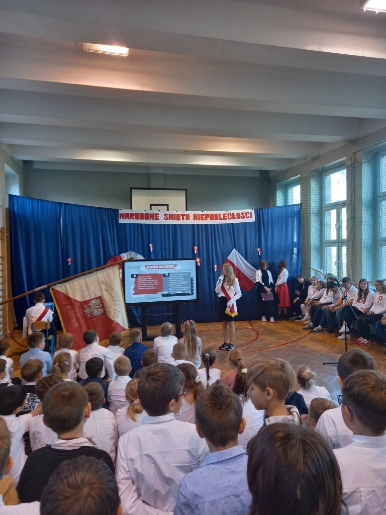 Uczennica klasy ósmej, Viktoria Cuda przedstawiła prezentację, która pozwoliła nam przypomnieć sobie wiadomości o czasach gdy Polskę odzyskała niepodległości w 1918 roku.