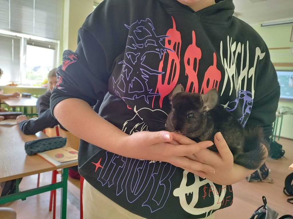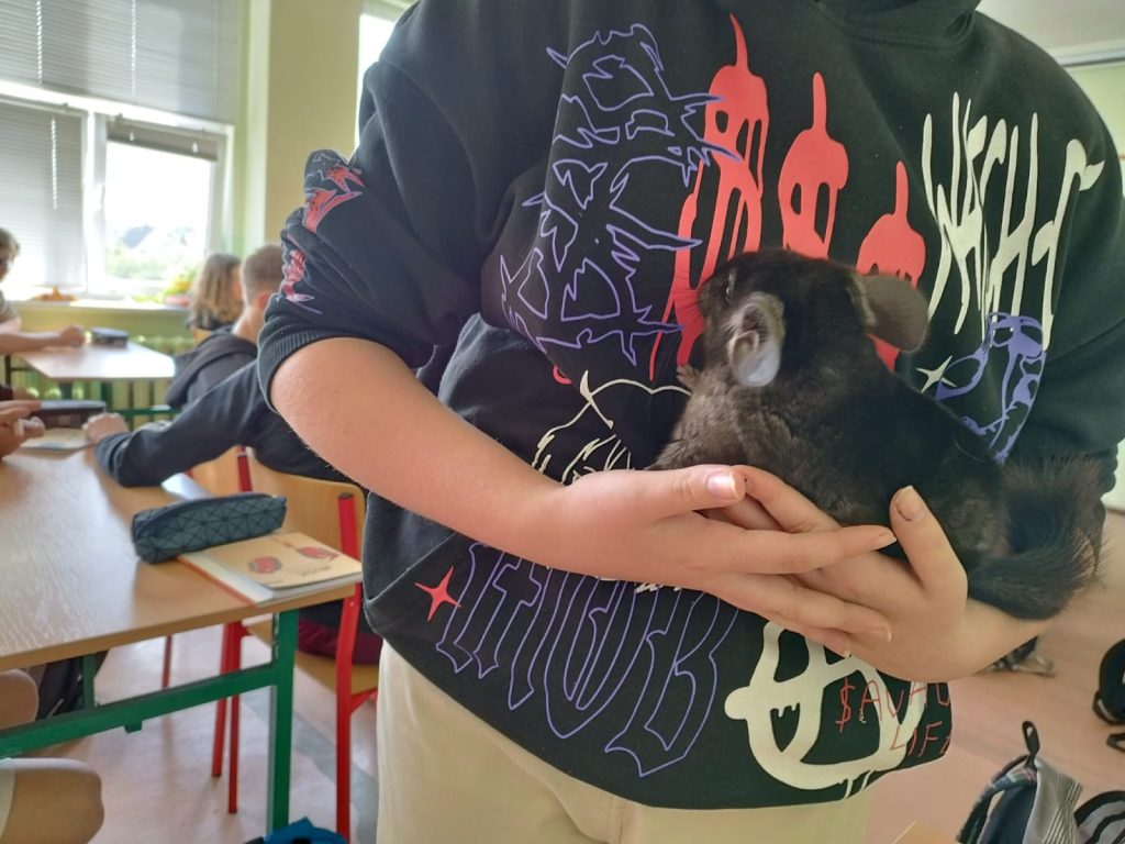 W dniu 16.05.2023 r. za sprawą ósmoklasistki – Emily Fikus, odwiedził nas jeden z przedstawicieli szynszyli małych – Lucek. Uczennica opowiadała o żywieniu szynszyli, opiece nad nimi, higienie (w szczególności o sposobie mycia futra), o rozmnażaniu oraz o jego zachowaniu w różnych sytuacjach.