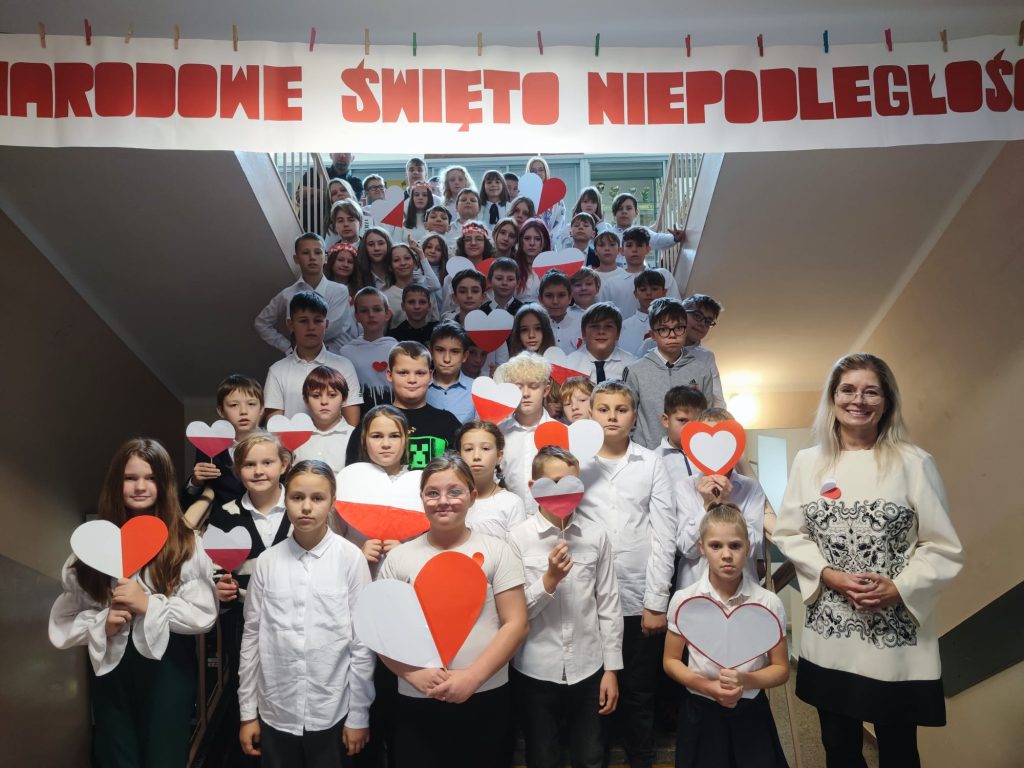 Szkoła przybrana w biało czerwone serduszka przypominała nam o symbolach narodowych, a serduszka w naszych dłoniach pozwoliły nam pozdrowić wszystkich Polaków z okazji naszego wspólnego święta:)